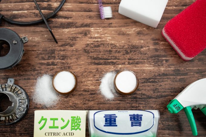 油汚れには重曹、水垢にはクエン酸、軽い汚れには混ぜて使う